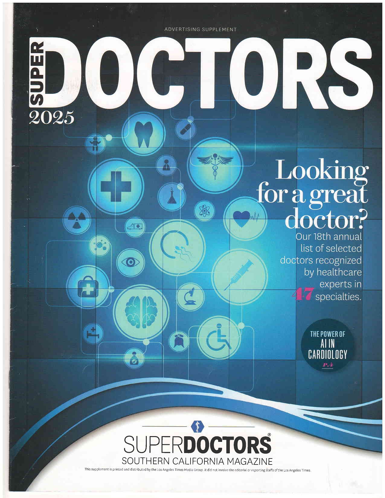 He was once again named to Southern California Super Doctors® for 2025. He was selected by his peers as an outstanding practicing doctor in Southern California. After an extensive nomination and research process conducted by MSP Communications, the results were published in Southern California Super Doctors, a separate publication distributed with the January 2025 issue of the Los Angeles Times.
